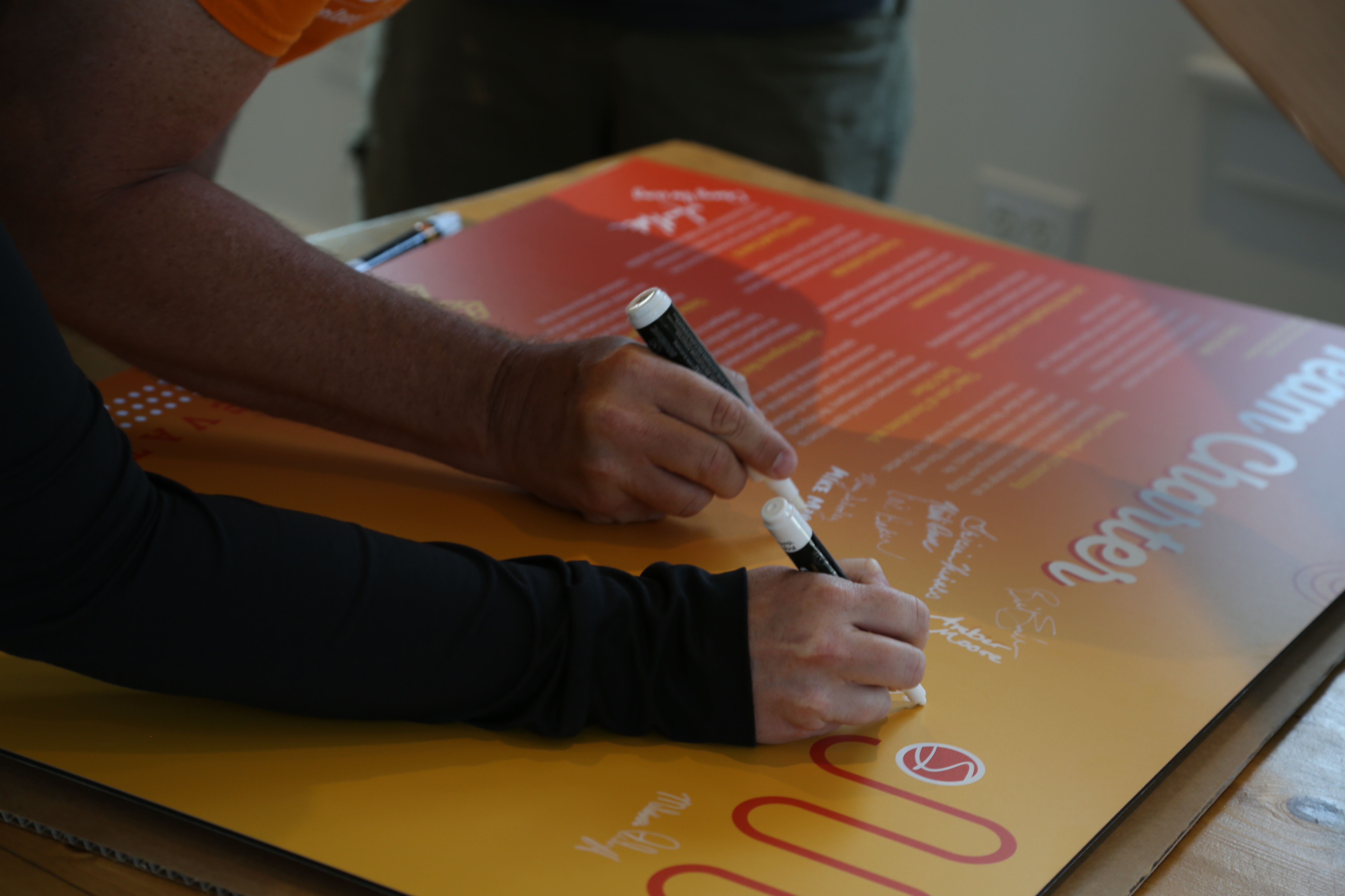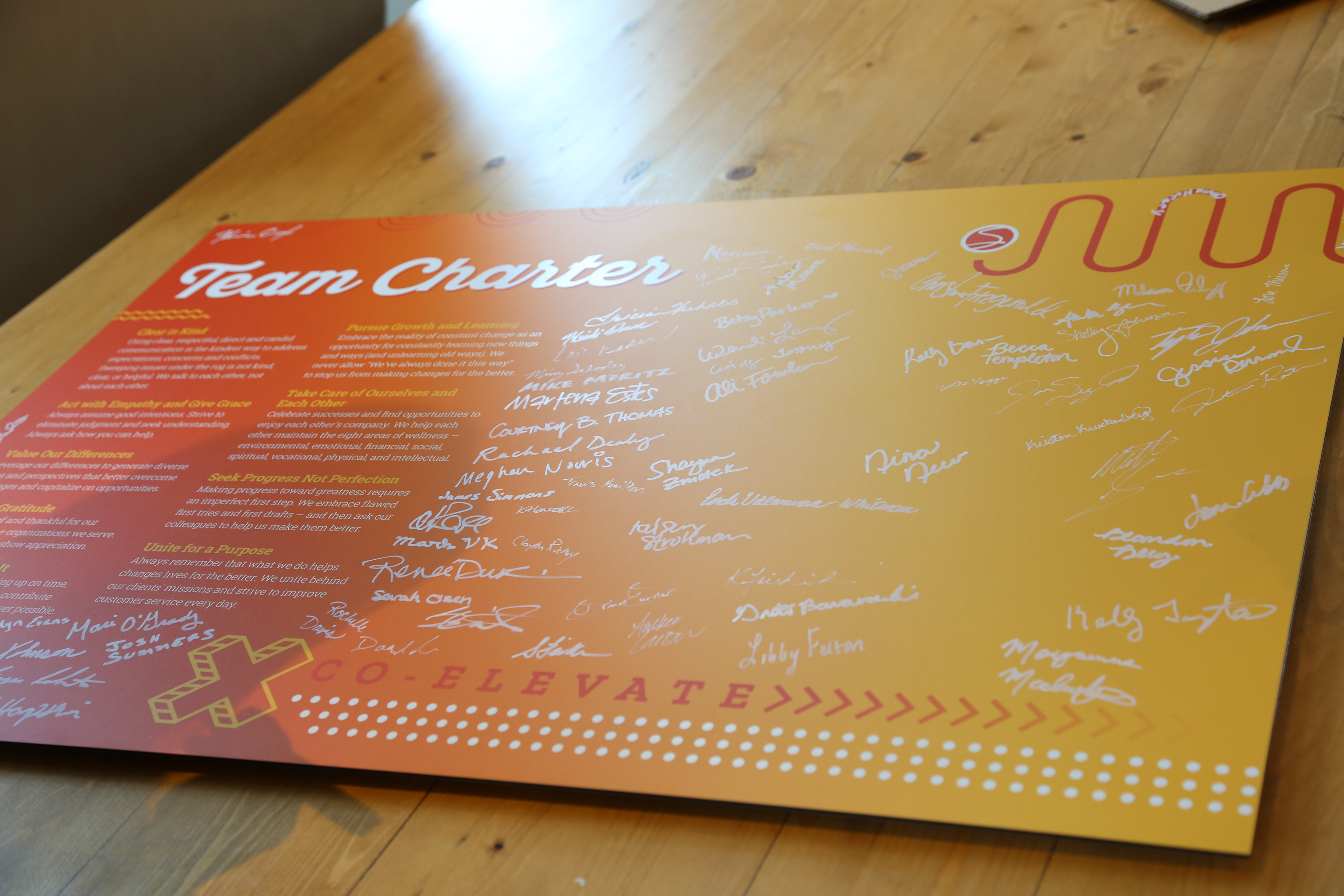 A group of Stelter staff unveil the Team Charter to the company. Staff make it official by signing their name.