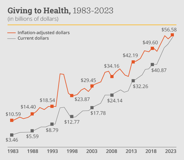 Giving to health reached $56.58 billion last year. Thatโs an increase of 8.7% in 2023, or a 4.4% increase adjusted for inflation.