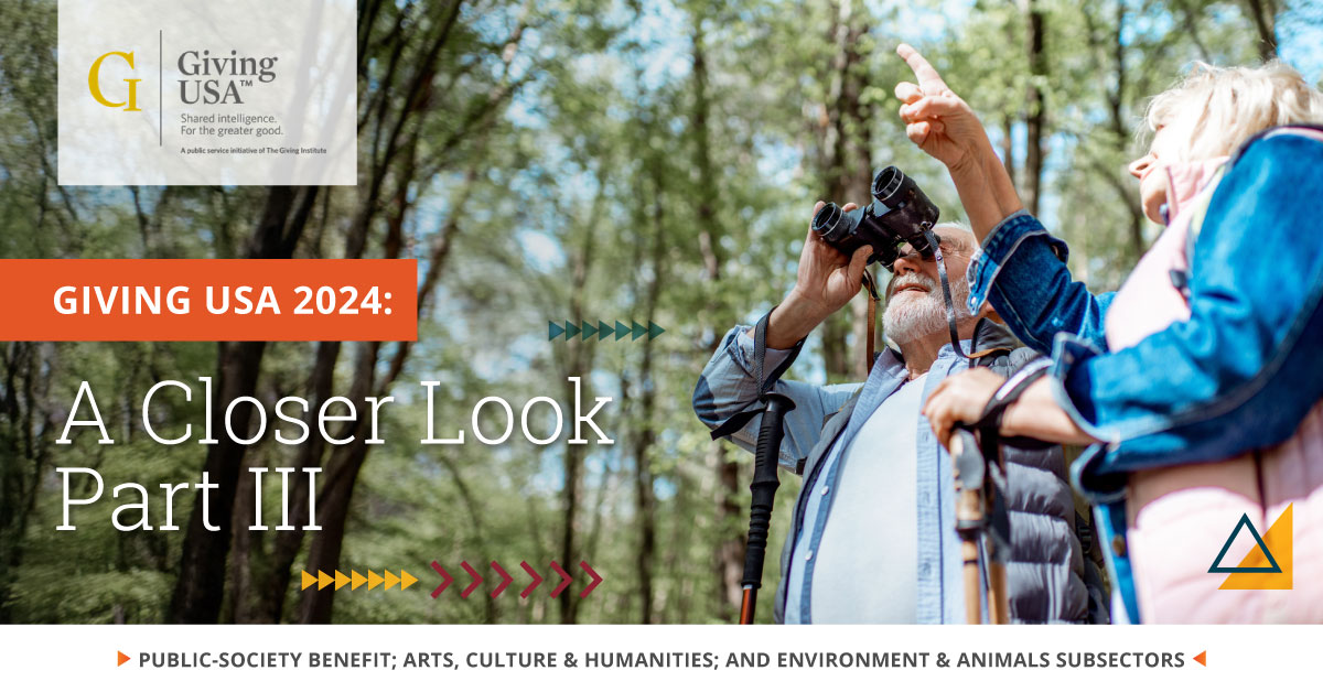 We continue our series on Giving USA 2024 with a look into three of the smaller subsectors: Public-Society Benefit; Arts, Culture and Humanities; and Environment and Animals. Together, these subsectors received roughly 17% of total giving to nonprofits in 2023. Giving in these subsectors increased between 2022 and 2023, with inflation-adjusted increases ranging from 3.9% (environment and animal organizations) to 7.2% (public-society benefit organizations).