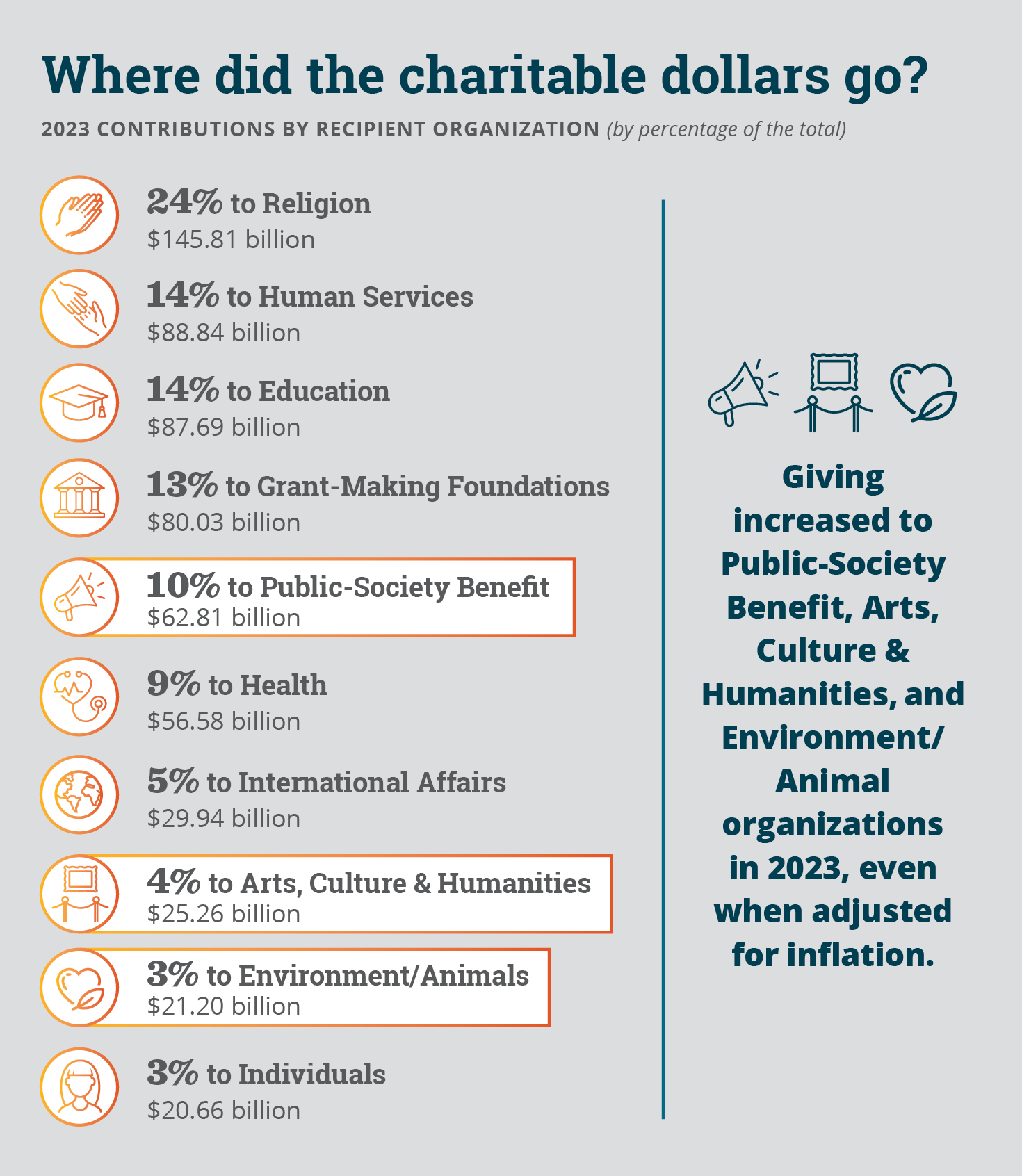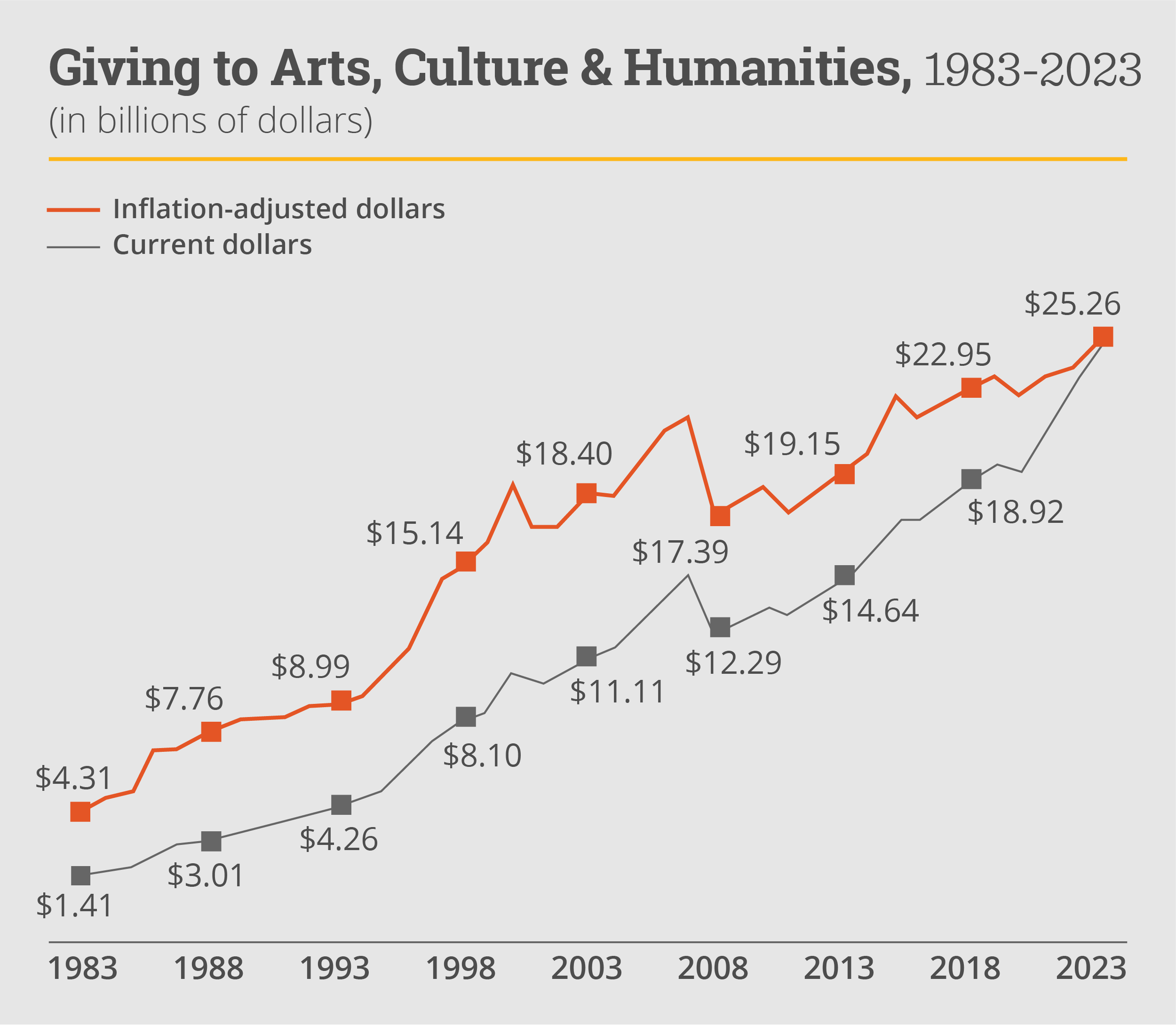 Giving to arts, culture, and humanities organizations saw a resurgence in 2023, following a dip during the COVID-19 pandemic. The subsector received $25.26 billion in 2024, or 4% of all 2023 contributions. This is an 11% increase in gifts from the prior year, and a 21% increase over the last two years, reaching a record high when adjusted for inflation​.