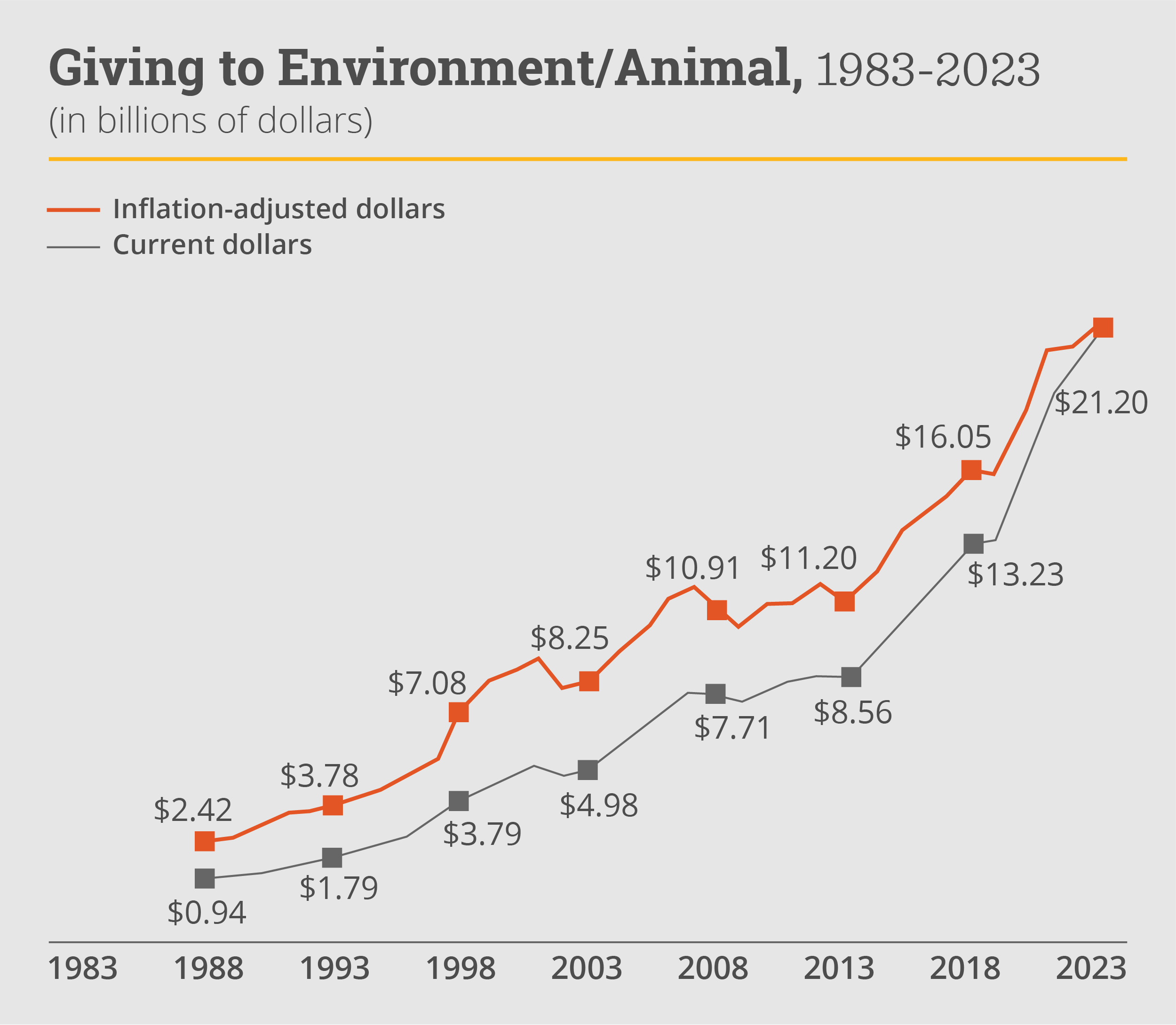 In 2023, giving to this subsector grew by 8.2%, or 3.9%, when adjusted for inflation. This growth reflects rising awareness of environmental crises such as wildfires, extreme heat, deforestation and endangered species. Total contributions to environment and animal organizations amounted to $21.20 billion, or 3 percent of all charitable giving in 2023.