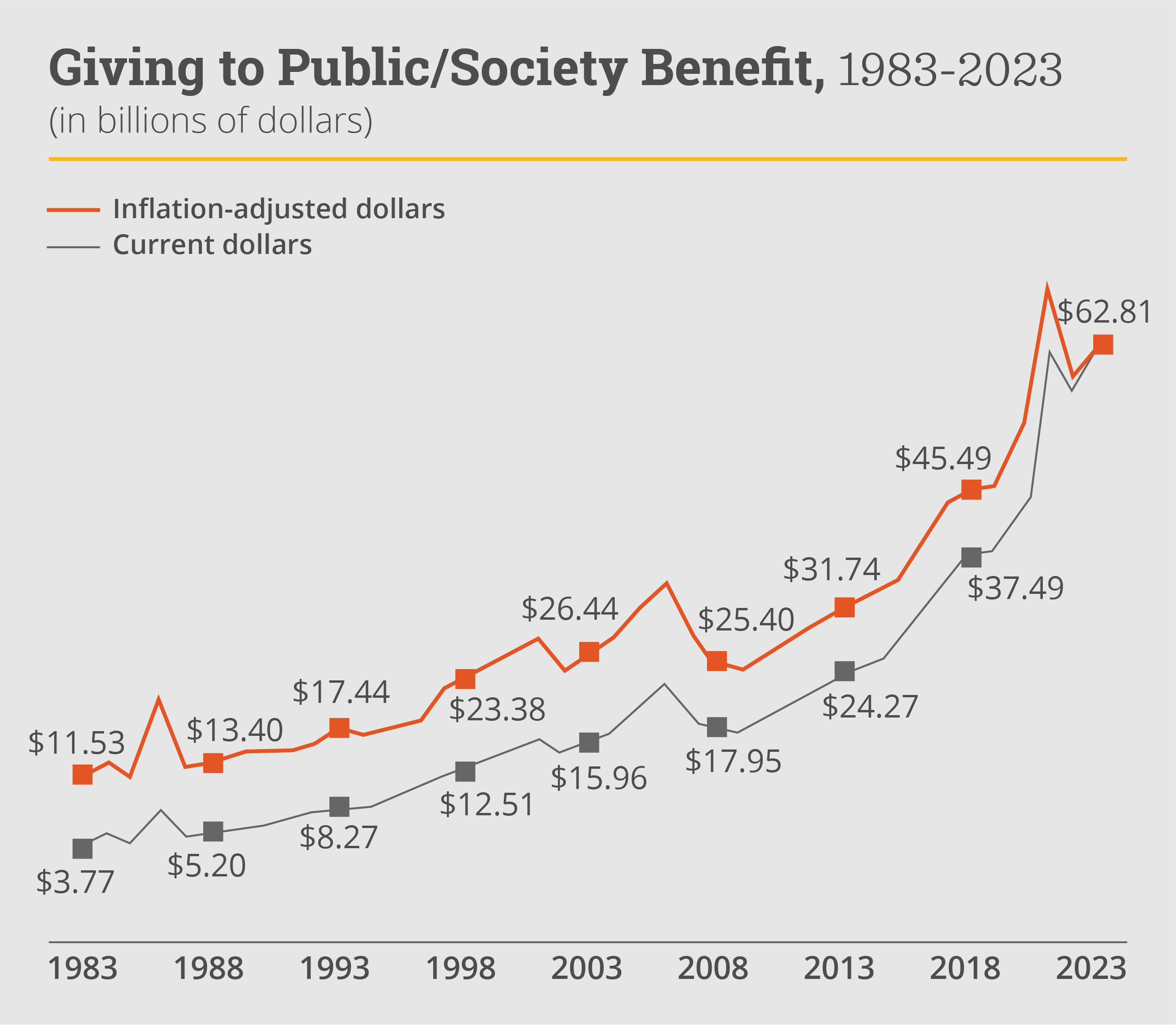 Much of the growth in this subsector can be attributed to large gifts, including bequests, from philanthropists focused on systemic change. Notable contributors include MacKenzie Scott, who made significant donations to 30 public-society benefit organizations in 2023.